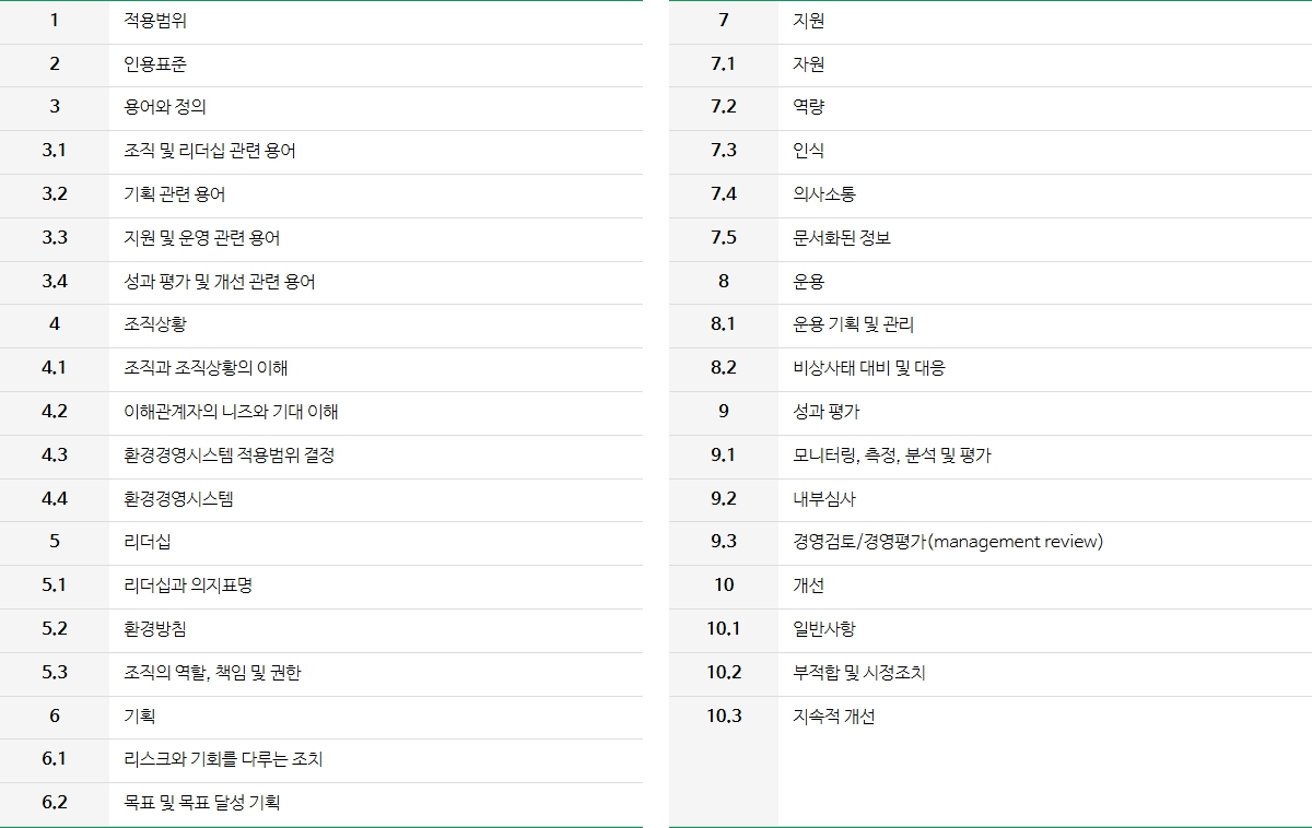 ISO 14001은 모든 산업 분야 및 활동에 적용할 수 있는 환경경영시스템에 관한 국제규격입니다. 기업은 환경경영시스템을 통해 환경측면을 체계적으로 식별, 평가, 관리 및 개선함으로써 환경위험성을 효율적으로 관리할 수 있습니다. |